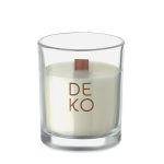 Dišeča sveča iz rastlinskega voska, z vonjem vanilije, 80 g, v steklenem kozarcu z lesenim stenjem. Čas gorenja: 14 ur.